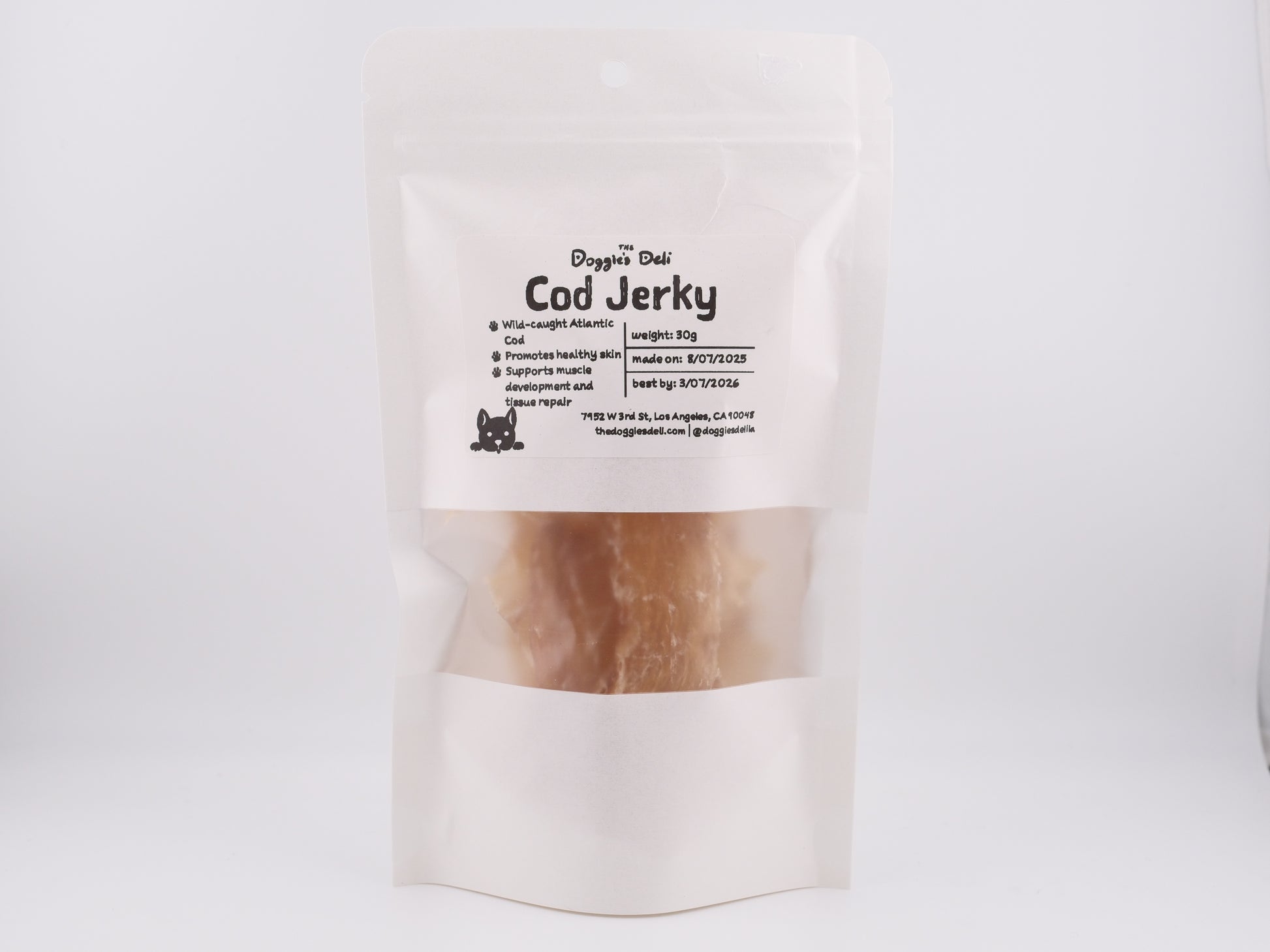 The Doggie’s Deli cod jerky stands out because it is made from 100% wild caught Atlantic cod with no additives or preservatives. The cod is ethically sourced, gently cooked, and packaged without any chemical processing to maintain its nutritional integrity and flavor.